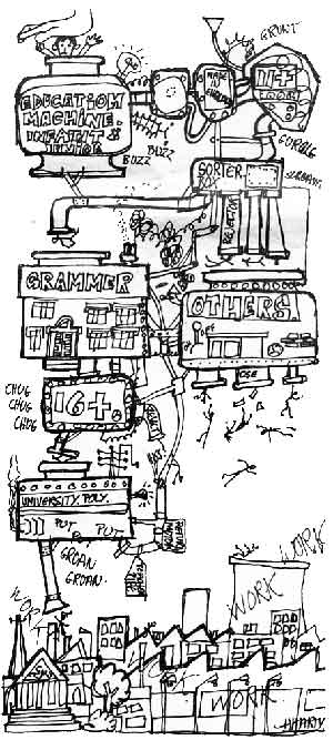 The System You have been brainwashed to want to own things - a stereo, a coloured telly, a bike - not because you need to own them, but so that someone will make a profit when you buy them - and so that you will have to work (and make someone else a profit) to pay for them. This is the vicious circle of the Capitalist Consumer System. You have been brainwashed to want to marry, and have a family of 2 so that you will form a stable social unit of the economic machine that keeps the system going. All of your life is dominated by the need for someone to make a profit out of you. Education is given, work is provided, law is enforced, only because they are needed by the Capitalist System of profit, private gain, and private ownership. 95% of the wealth of this country is in the hands of 5% of the people. And this 5% controls the way you have to live, the things you will be brainwashed to want, and the way you will have to work to get them. If you get a job your boss will demand a large chunk of your life so that he can make money out of you. He will listen to your demands and your needs only when to resist would threaten his profit. He will sack you when he does not make enough. The main political parties - Labour, Conservative, Liberal - are simply trying to get the system to work better. They cannot see, or do not want to see, that it is the system itself which is wrong. They pretend to be democratic but in effect allow a handful of people in business, or parliament or the local council to use their power to control us. They have a vested interest in keeping the system going as it is. Your parents will blackmail you with their "love" to get you to do what they want. The system needs a stable family unit to keep production and profit going, and uses your parents to see that they produce one. The press, the telly, and all advertising is designed to make you want more so that you will have to make more, and so that someone will make more profit. Why do adults fall for this? There are many reasons. Your parents and your teachers have taught you to conform to this system because they were brainwashed to conform themselves - and because most of them are too selfish, or too scared to do anything else. They have learned to do as they are told. Many adults see the young as a threat to their authority, their jobs, and their security. They will use all the powers of the system, its rules and its regulations to beat you. In some cases their resentment will be based on their sexual frustration and your sexuality - they think you live on drugs and orgies. They would like to join you but they are afraid and feel guilty. They will try to punish you for their guilt. In some cases they will want to love you - but fear and convention will make them seek self defence in hate. But the basic reason why adults fear and mistreat the young is because they are all victims of a system based on selfishness and greed. All authority, parliament and the law, all rules and regulations, schools and colleges, the churches, the political parties, the family - all of these are distorted to keep the Capitalist system of private property and profit going. And the schools teach us to want to be exploited in this way, to want a lousy job, to want to "get on", to want their stupid qualifications and high positions, to want to buy the unnecessary, unimportant goods that the system forces us to produce. The alternative to this capitalist system is a society where "work" is carried out by those who can do it for those who need it. A person will be "paid" according to his needs. They will give what they can and want to do in the way they want to do it. Some people call this system Socialism, some call it Communism, or Maoism, some call it Anarchism. No-one has created this society completely yet but many are trying. It will be difficult to achieve but the alternative is the continuation of the system where we are slaves being forced to work for someone else's profit - even if we become willing slaves.